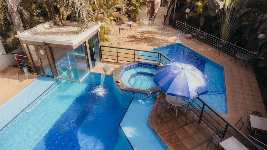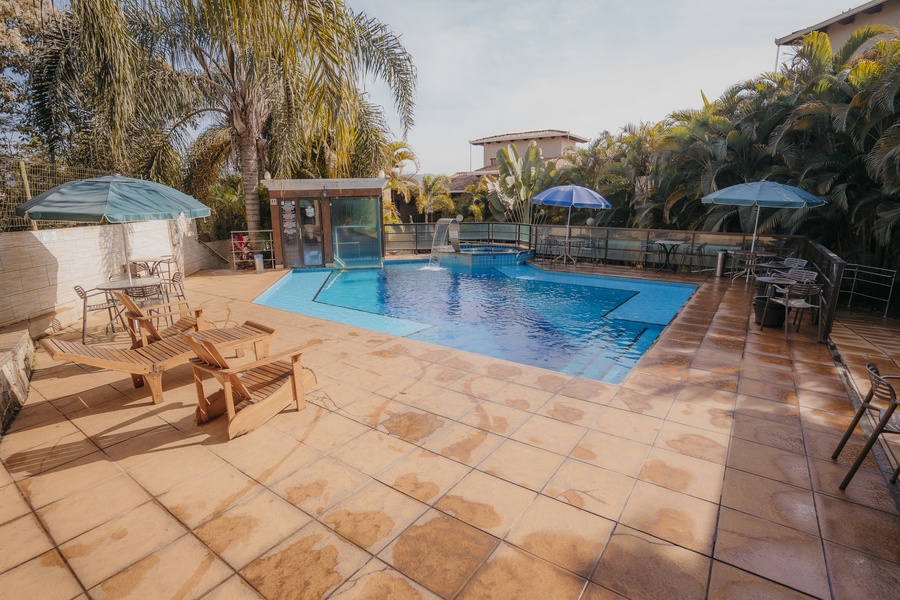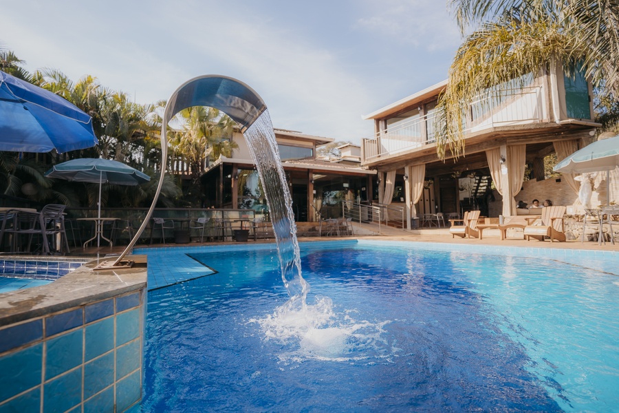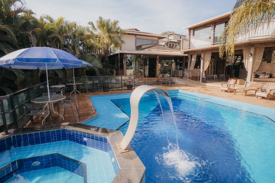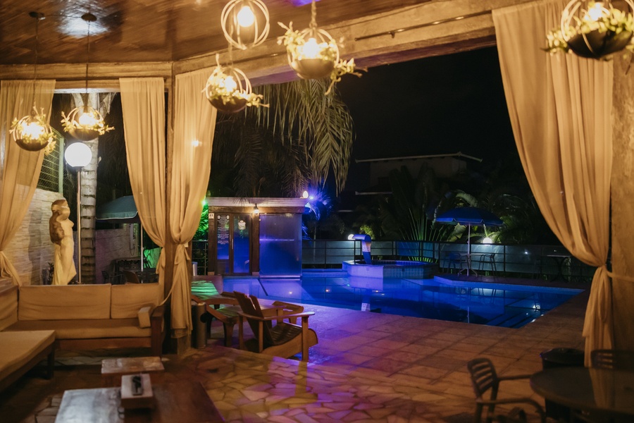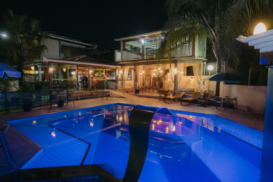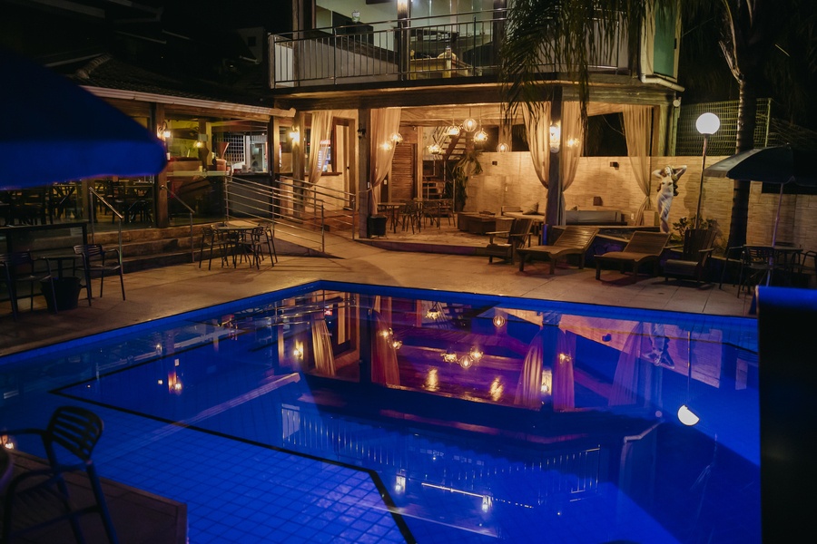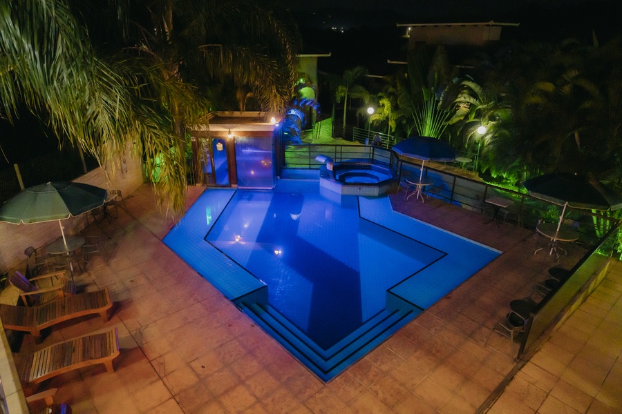 Um espaço para relaxamento, com linda iluminação noturna. As entradas para a sauna e hidromassagem são interligadas à piscina.
