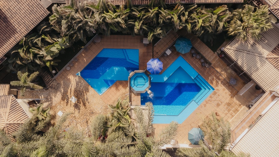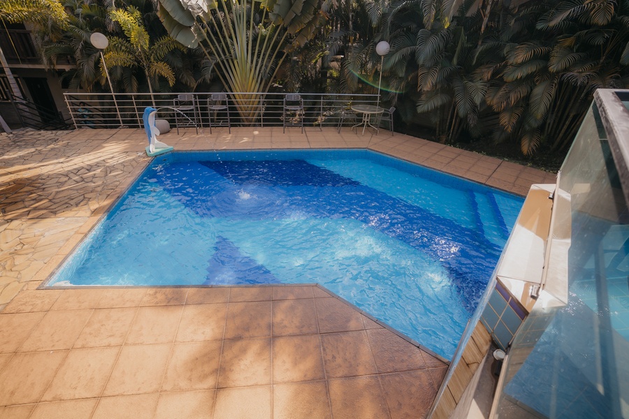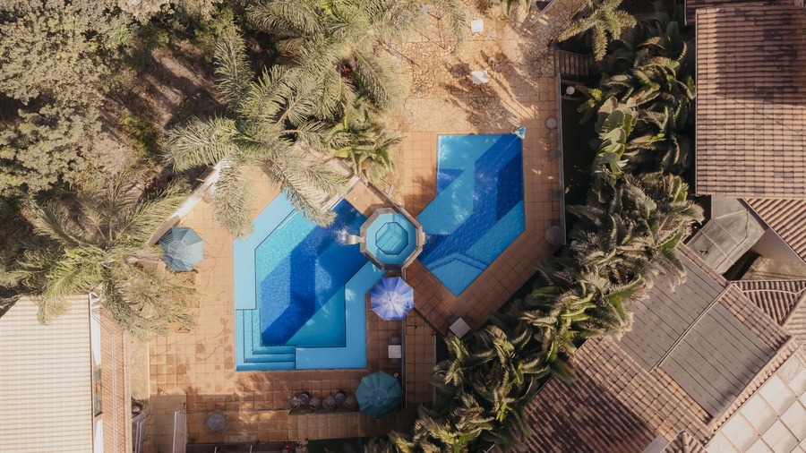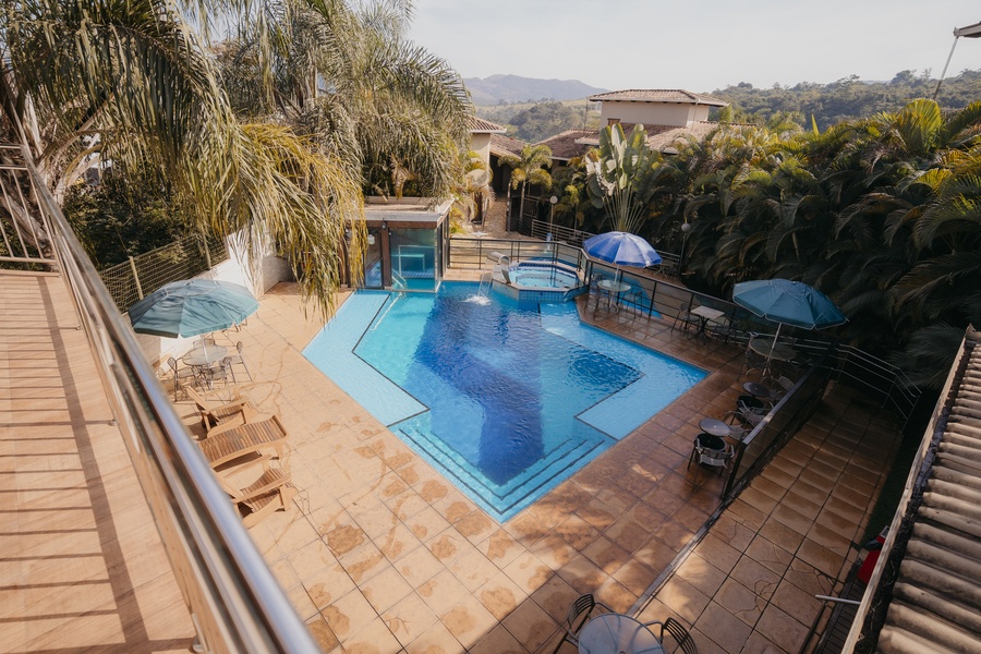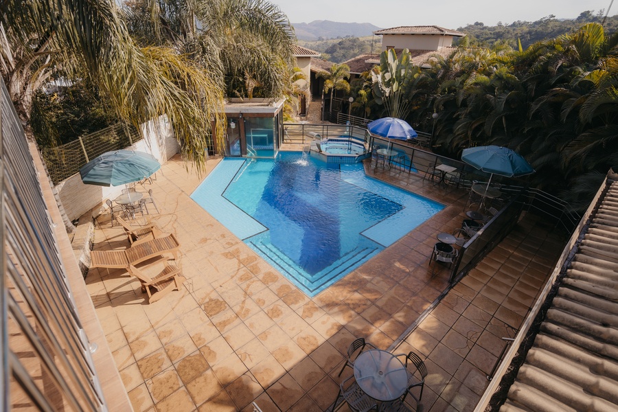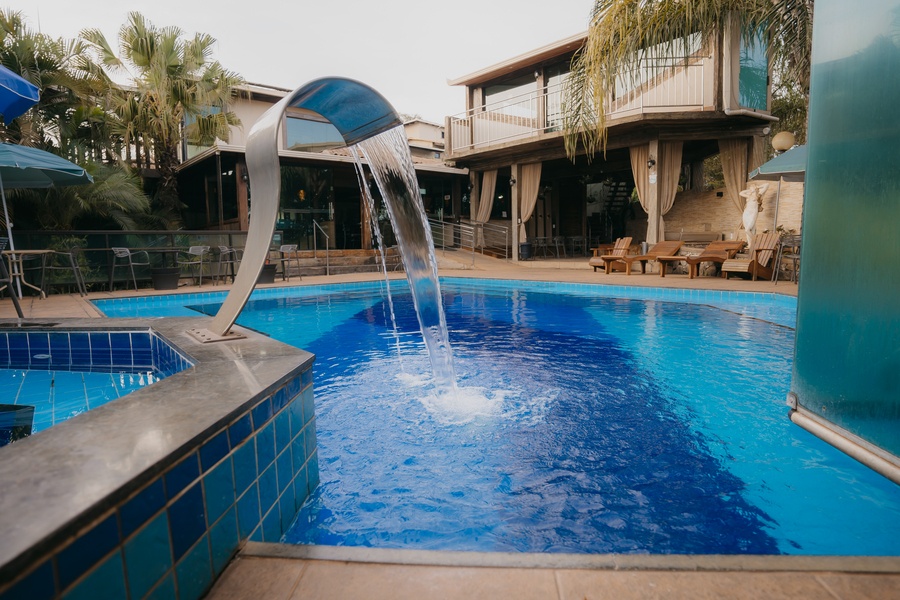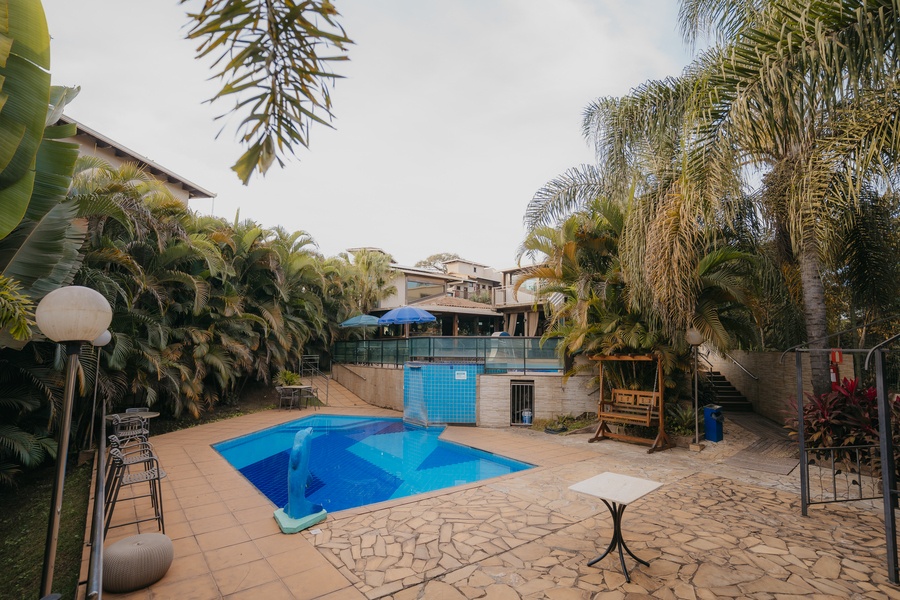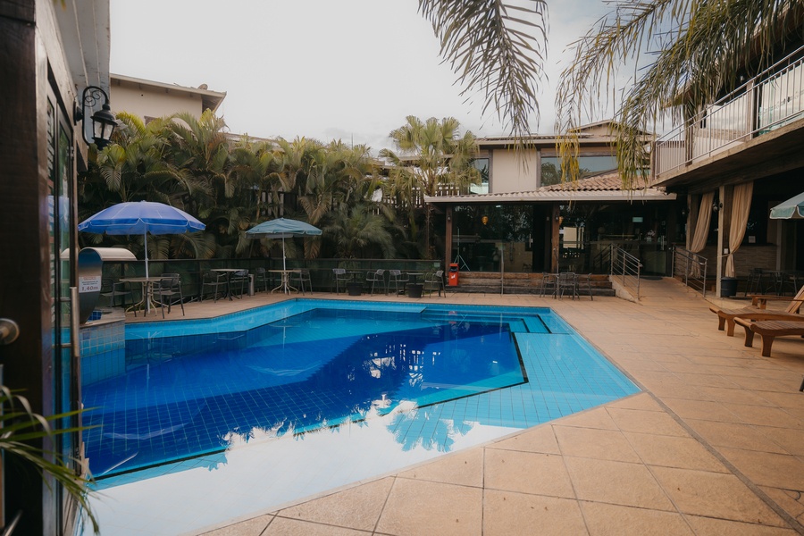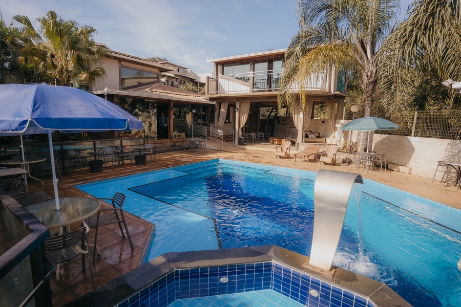 Um espaço para relaxamento, com linda iluminação noturna. As entradas para a sauna e hidromassagem são interligadas à piscina.